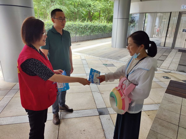 在星慧社區,中新智地的黨員們以紅色管家志愿者的身份與社工、網(wǎng)格員一同在小區內部、星湖天地商業(yè)街及各商鋪內為路人、居民和店員分發(fā)“嚴防欺詐”宣傳單,普及宣傳反詐騙知識,助力提升社區居民防范意識。