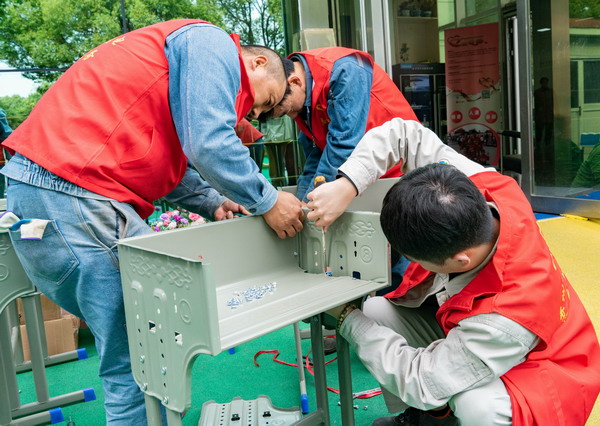 蘇州藍天熱電聽(tīng)聞博愛(ài)學(xué)校新到一批課桌椅,需盡快投入教學(xué)使用,但目前安裝存在一些困難。藍天熱電黨支部立即行動(dòng)起來(lái),組織黨員志愿者次日前往協(xié)助安裝。黨員志愿者分工合作,有的用工具擰緊螺絲釘安裝凳腳、椅背、課桌柜等;有的將初步安裝好的零件整合起來(lái)形成嶄新完整的課桌;有的則當起“質(zhì)檢員”,檢查組裝好的課桌椅是否穩固。經(jīng)過(guò)半天的努力,40套課桌椅全部組裝完備。