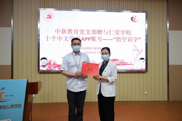 中新教育黨支部秉承“伙伴三人行,仁愛(ài)同心圓”黨建理念,持續關(guān)注仁愛(ài)學(xué)校學(xué)生的學(xué)習和成長(cháng)。在本次的主題黨日活動(dòng)中,中新教育黨支部贈與仁愛(ài)學(xué)校十個(gè)“悟空識字”APP賬號,為大家有效學(xué)習提供一定的幫助。未來(lái),中新教育黨支部將繼續不忘教育初心,全面推進(jìn)“博融中西 新育英才”黨建項目,積極助力園區教育事業(yè)和諧發(fā)展。