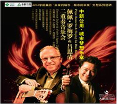 6月,吉他大師佩佩•羅梅羅與著(zhù)名小提琴手呂思清兩位泰斗級大師同臺獻藝,帶來(lái)《中新公用•城市夢(mèng)想樂(lè )章 佩佩•羅梅羅&呂思清二重奏音樂(lè )會(huì )》。最具品質(zhì)的古典盛宴,藝術(shù)和感官的絕美旅途,古典吉他與小提琴的非常見(jiàn)組合為您呈現別樣感受!