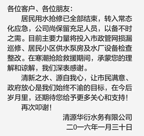 過(guò)去一段時(shí)間,寒潮引發(fā)供水系統管道和水表?yè)p傷和凍壞,困擾了蘇州工業(yè)園區部分小區和居民,給大家日常生活帶來(lái)不便。經(jīng)過(guò)不分晝夜的作業(yè)和不計代價(jià)的付出,1月30日,中新公用旗下蘇州工業(yè)園區清源華衍水務(wù)有限公司正式宣布,搶修工作基本完成,園區居民用水基本恢復正常,并向客戶(hù)表示感謝。