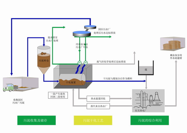 項目選址于蘇州東吳熱電有限公司廠(chǎng)區內, 緊鄰園區第二污水處理廠(chǎng),最大程度的縮短了脫水污泥和干污泥的運輸距離。污泥廠(chǎng)利用熱電廠(chǎng)的余熱蒸汽和污水廠(chǎng)產(chǎn)生的中水干化污水廠(chǎng)產(chǎn)生的污泥,干化后的污泥作為生物質(zhì)能用于熱電廠(chǎng)焚燒發(fā)電,產(chǎn)生的蒸汽冷凝水回到熱電廠(chǎng)作為鍋爐補給水循環(huán)利用,焚燒產(chǎn)生的灰渣作為建筑輔材;生產(chǎn)過(guò)程中產(chǎn)生的污水排回污水廠(chǎng)進(jìn)行處理后達標排放,實(shí)現了污泥廠(chǎng)、污水廠(chǎng)與熱電廠(chǎng)之間資源共享、協(xié)同發(fā)展。