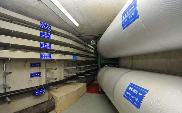 不止九通一平的地方,園區月亮灣商務(wù)區算一處。月亮灣地下綜合管廊內,除了常規的供水、供氣、電力、路燈、供熱等管道,別的地方少有的“供冷”管道赫然在列。
