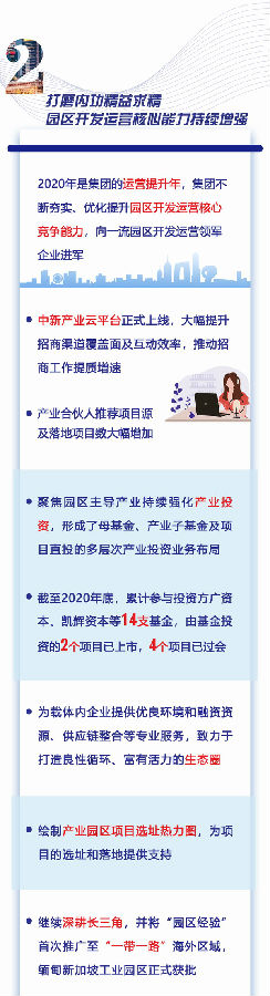 2021年,中新集團將全力聚焦園區開(kāi)發(fā)運營(yíng),繼續站在園區開(kāi)發(fā)運營(yíng)主體的高度上,不斷深入理解、勇于承擔主體的責任、使命和內涵,不斷實(shí)踐探索如何實(shí)現政治效益、社會(huì )效益、經(jīng)濟效益協(xié)調統一。充分完善、提升集團在項目拓展、規劃建設、軟件轉移、招商親商等四大節點(diǎn)核心競爭力,進(jìn)一步深耕細作,補充強化產(chǎn)業(yè)投資和配套服務(wù)兩大園區開(kāi)發(fā)運營(yíng)節點(diǎn),以產(chǎn)為核、以人為本,打通堵點(diǎn)、補齊短板,構筑完整的園區開(kāi)發(fā)運營(yíng)全鏈條閉環(huán)。