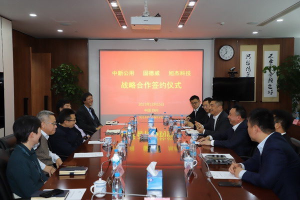 12月15日,中新公用、固德威技術(shù)股份有限公司(簡(jiǎn)稱(chēng)“固德威”)、蘇州旭杰建筑科技股份有限公司(簡(jiǎn)稱(chēng)“旭杰科技”)簽訂戰略合作協(xié)議,攜手進(jìn)入“新能源+儲能”和綠色低碳建筑領(lǐng)域,未來(lái)在光伏建筑一體化、碳達峰碳中和、低碳建筑及光伏新品研發(fā)等方面開(kāi)展長(cháng)期合作。中新集團董事長(cháng)趙志松出席簽約儀式,中新公用董事長(cháng)侍杰、固德威董事長(cháng)黃敏、旭杰科技董事長(cháng)丁杰代表各方簽約。