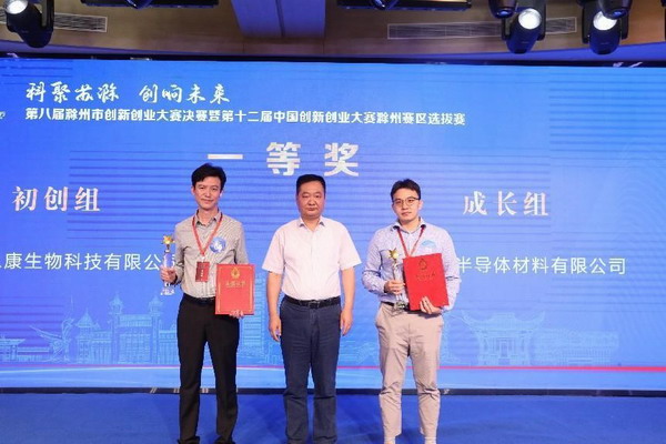 安徽施恩康生物科技有限公司、南大光電半導體材料有限公司分別摘得初創(chuàng )企業(yè)組和成長(cháng)企業(yè)組一等獎的桂冠;安徽中舟科創(chuàng )產(chǎn)業(yè)科技有限公司、安徽施恩康生物科技有限公司摘得“現場(chǎng)人氣獎”的殊榮。金融活水助力創(chuàng )新創(chuàng )業(yè),8家企業(yè)在活動(dòng)現場(chǎng)與建設銀行完成意向授信,總額度8000萬(wàn)元人民幣。根據獲獎情況,滁州市科技計劃項目創(chuàng )新創(chuàng )業(yè)專(zhuān)項優(yōu)先立項,全部推薦參加第十二屆中國創(chuàng )新創(chuàng )業(yè)大賽安徽賽區比賽。
