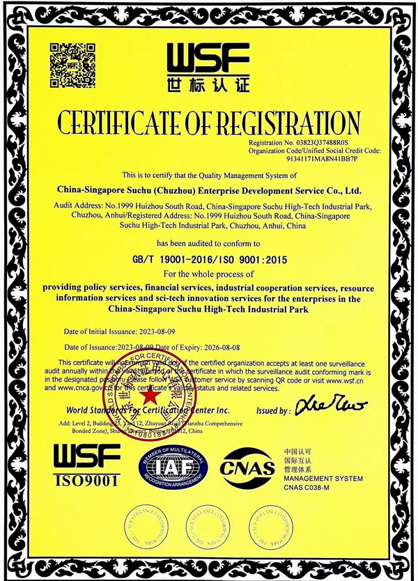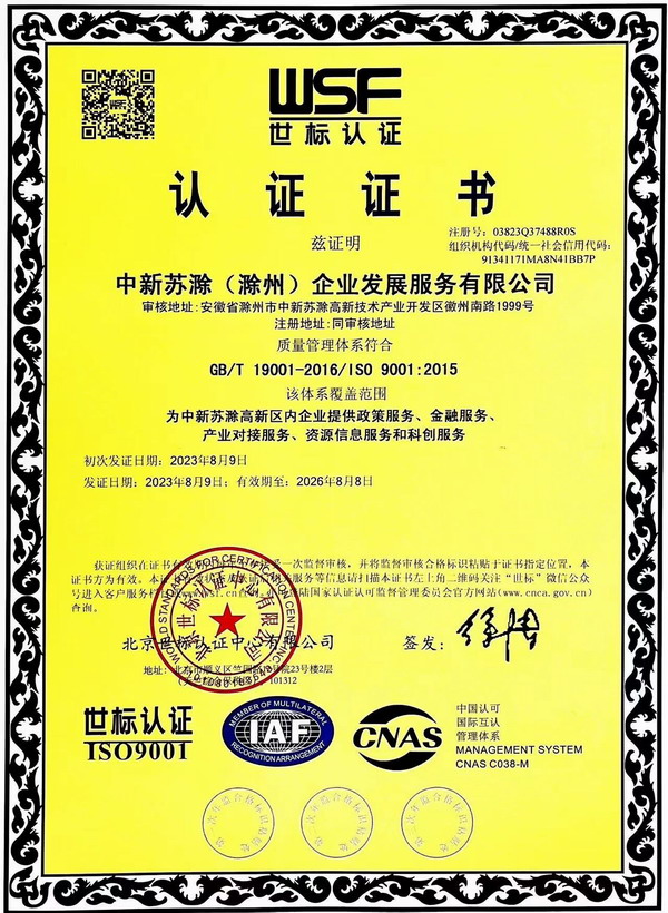 2023年8月,中新蘇滁高新區企業(yè)發(fā)展服務(wù)中心榮獲“ISO9001質(zhì)量管理體系認證”證書(shū)。