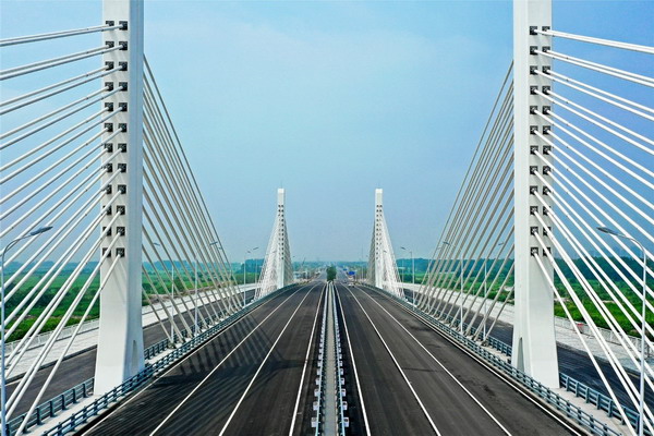 滁州大道跨清流河大橋工程(滁州大橋)位于安徽省滁州市中新蘇滁高新區,由中新蘇滁(滁州)開(kāi)發(fā)有限公司投資建設,華匯工程設計集團股份有限公司設計、安徽建工路港建設集團有限公司施工總承包。該橋為主跨135米的寬幅矮塔斜拉橋,橋面寬度60.5米,近期雙向6車(chē)道遠期雙向10車(chē)道。4個(gè)橋塔及斜拉索造型 簡(jiǎn)潔、有力、挺拔,展現了蘇滁園區及滁州市積極向上、勇于開(kāi)拓、敢為人先的精神風(fēng)貌。